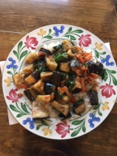 Roasted eggplant, spinach, tomato and rice